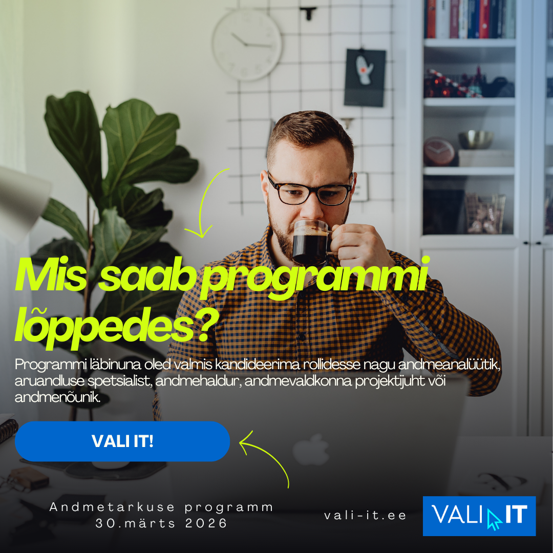 Tahad alustada karjääri andmeanalüütiku, andmehalduri või andmevaldkonna projektijuhina? Või arendada oma tööalast tulemuslikkust andmepõhise otsustamise ja analüüsiga? „Vali Andmetarkus!“ intentsiivne programm annab sulle kõik vajalikud teadmised ja praktilised oskused, et astuda kindel samm andmevaldkonda. Lisaks toetame sind ka karjäärimuutusel ja aitame jõuda tööandjateni.